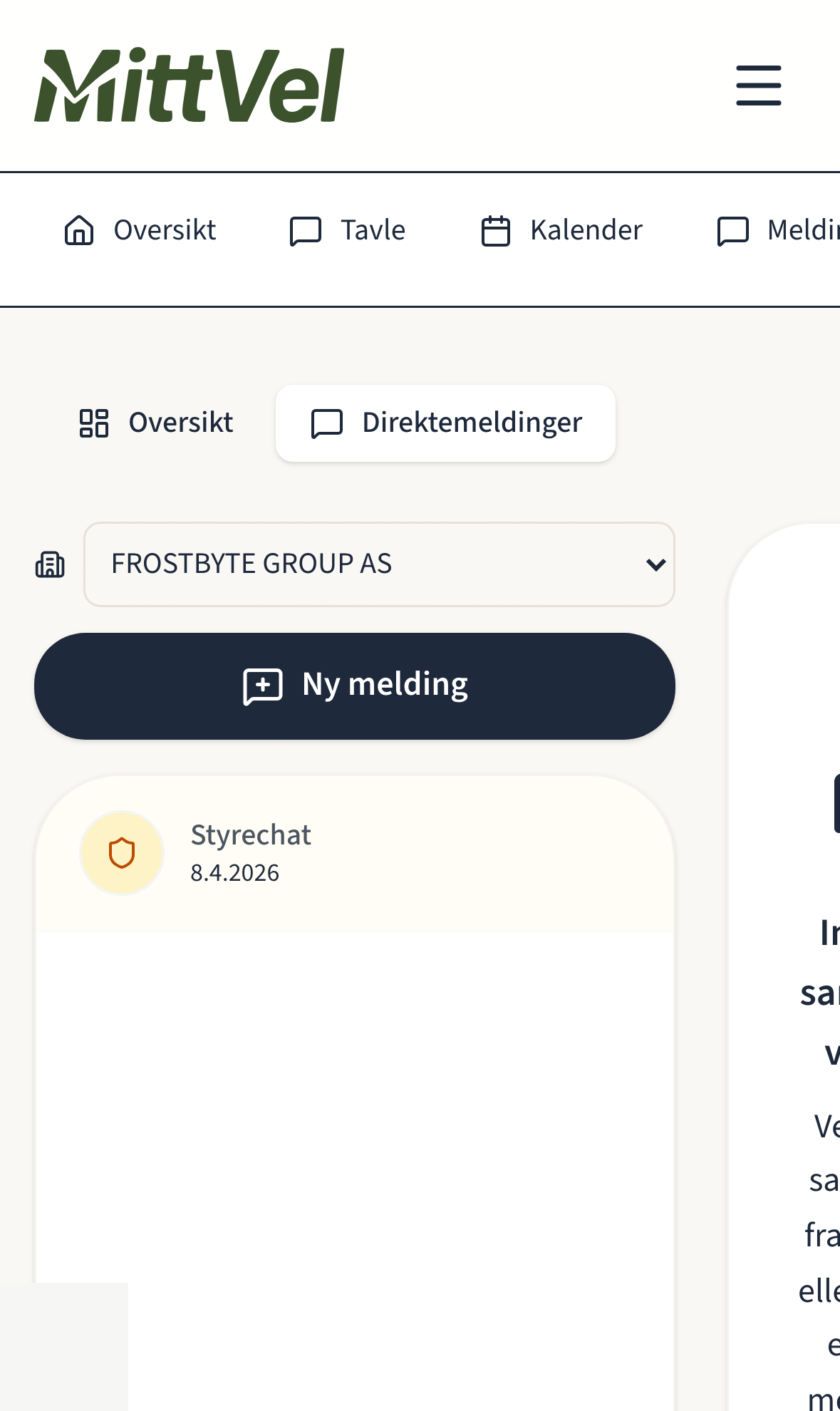 Noen ganger trengs en privat prat. Med den innebygde meldingsfunksjonen kan beboere kontakte styret eller hverandre direkte. Det føles akkurat ut som de chat-appene de allerede er vant til, bare mer organisert og privat for nabolaget.