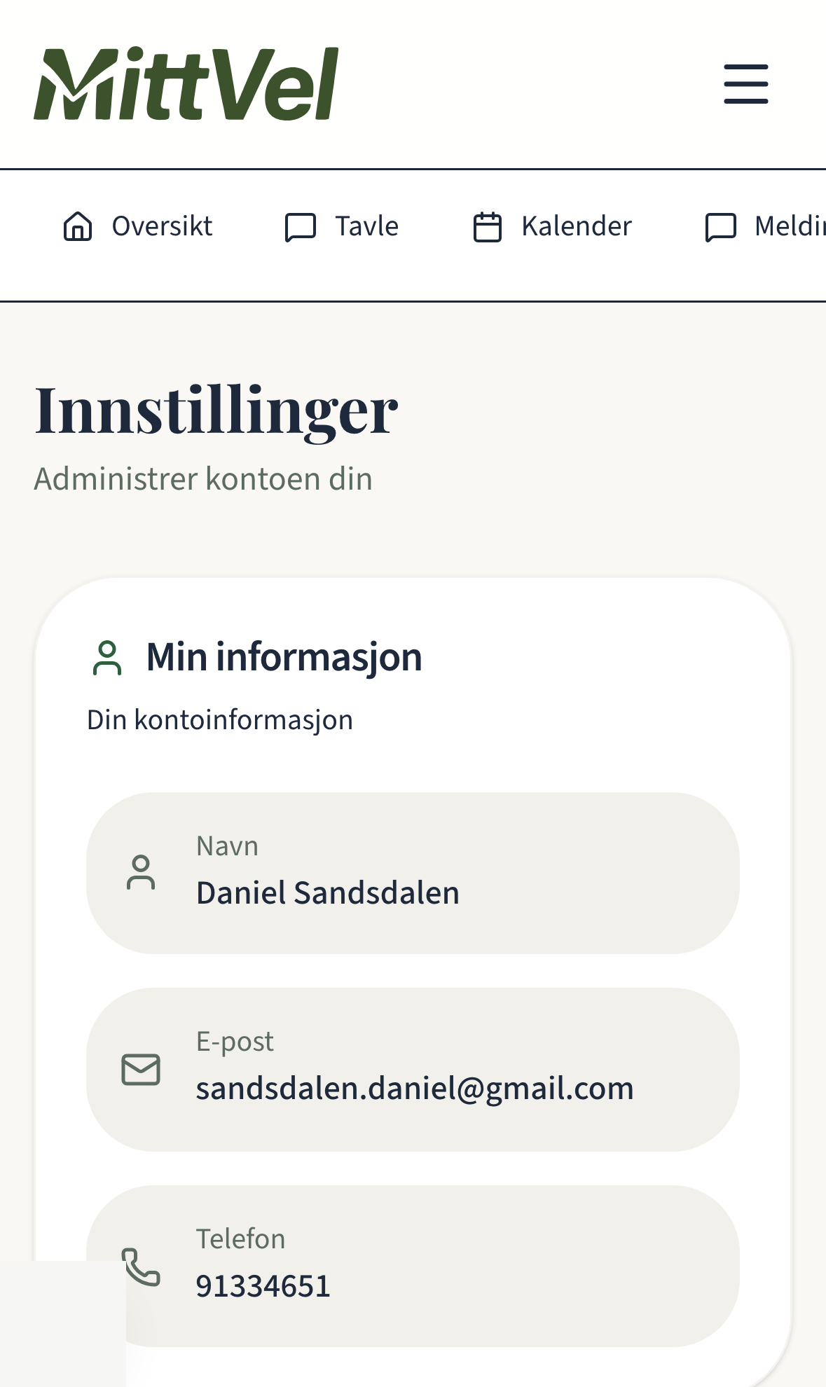 På profilsiden kan hver beboer se sin kontaktinformasjon og administrere kontoen sin.