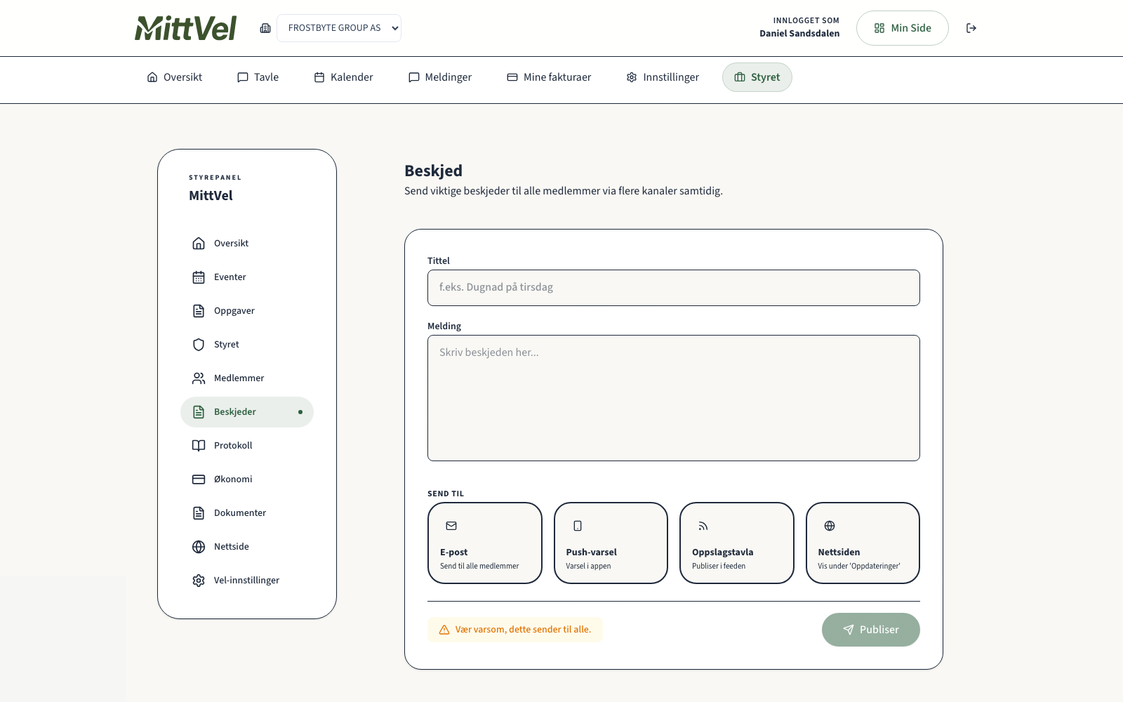 Dette er funksjonen dere bruker for informasjon som alle må få med seg, for eksempel dato for årsmøtet eller at veien blir stengt for brøyting.