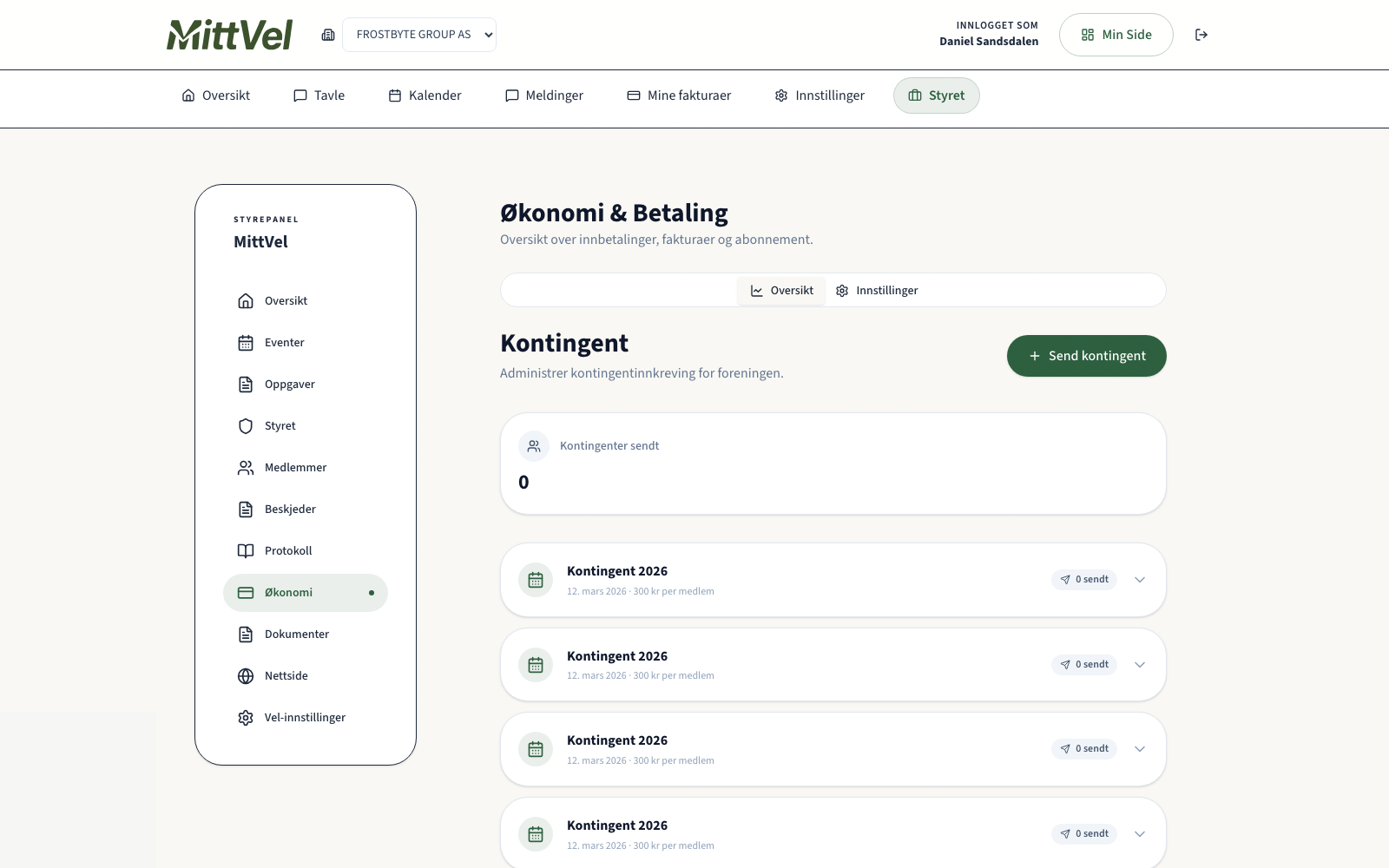 - Fiken-integrasjon: Lar dere se automatisk i MittVel hvem som er betalt, ubetalt og forfalt.