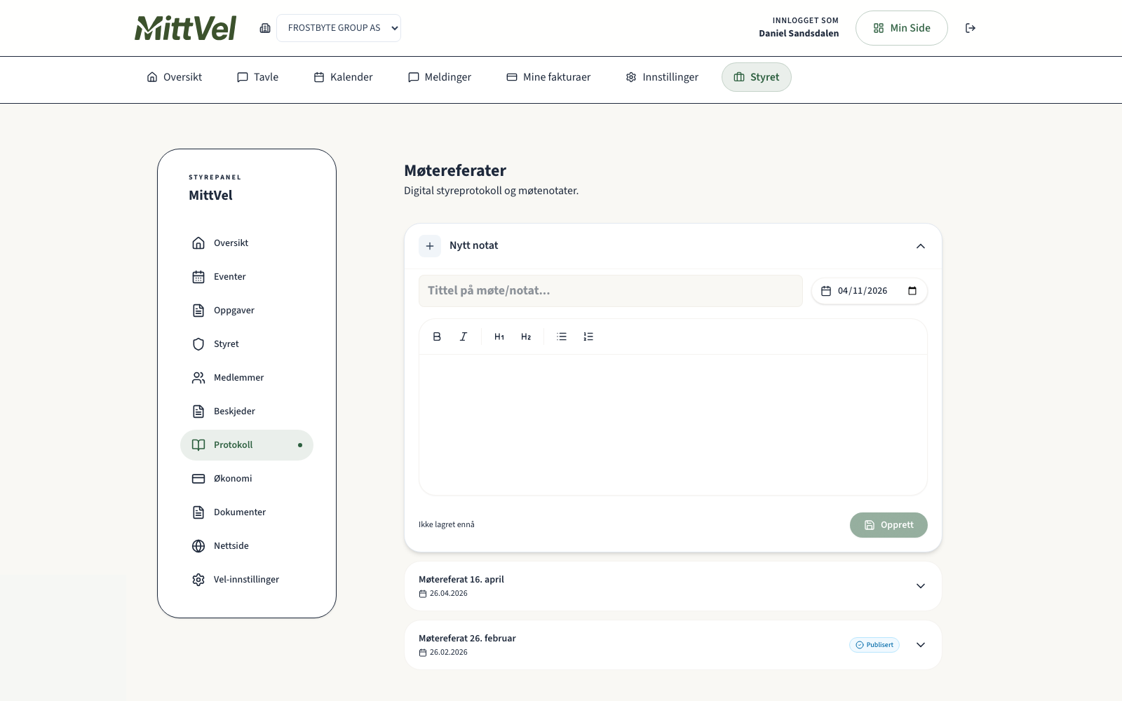Protokoll-fanen brukes til referater og vedtak med tydelig historikk.