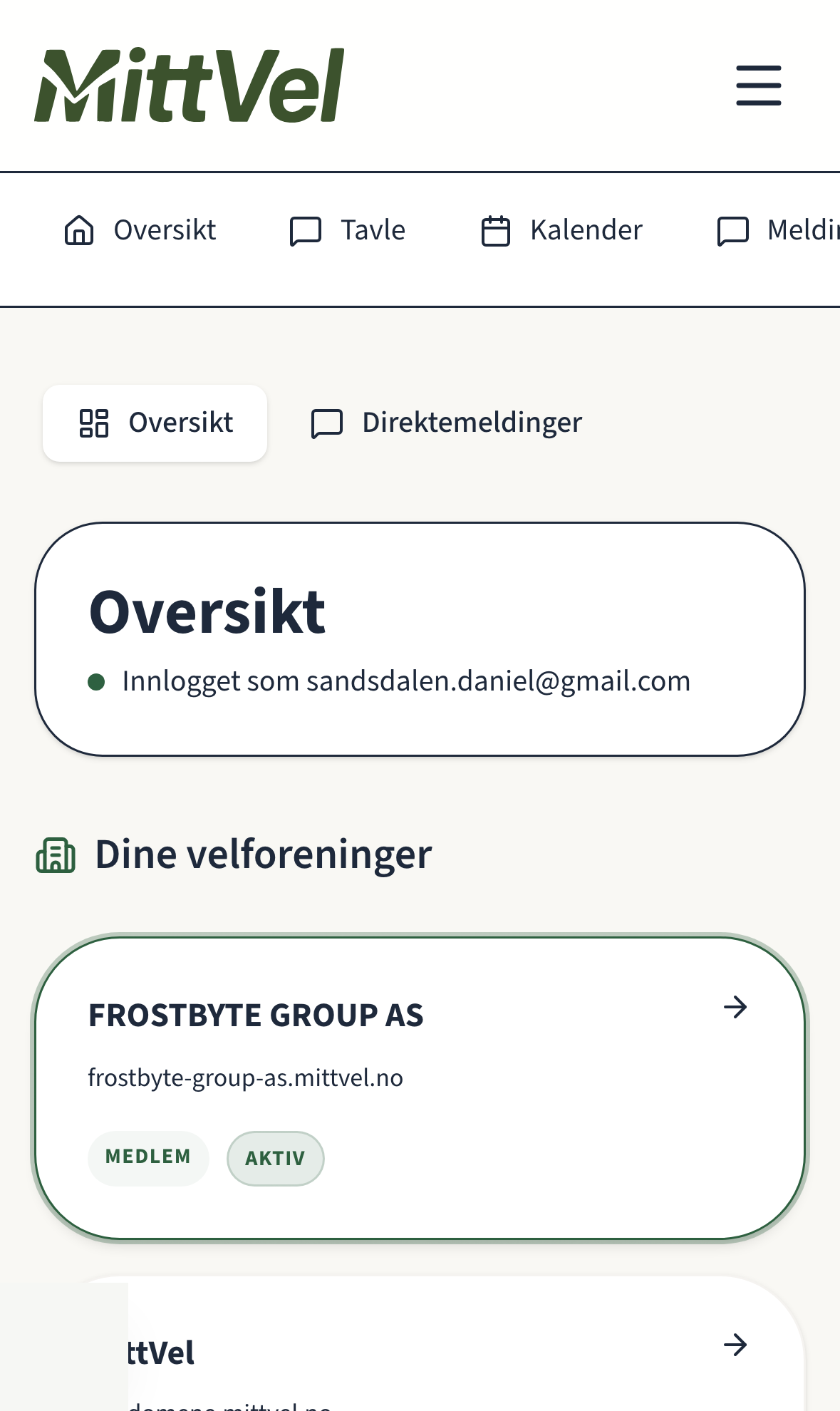 Når beboerne logger inn via e-posten sin, møtes de av en ren og enkel oversikt. Her ser de umiddelbart sine aktive velforeninger og de viktigste snarveiene de trenger i hverdagen.